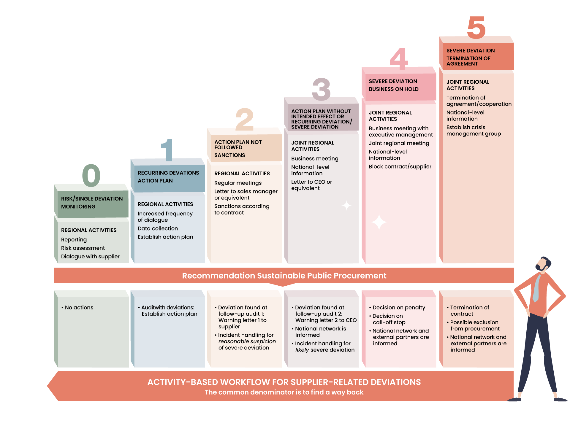 The Regions’ Joint Escalation Ladder is based on the principle that if deviations or potential risks are identified in the supply chain, the contracting authority and the supplier must always work together to address the deviation or risk as quickly as possible. The aim is to minimise the risk of disruptions to the regions’ operations.
