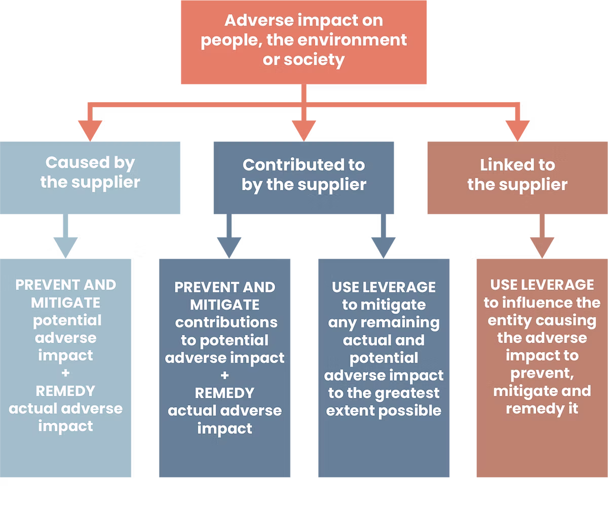 However, if you have not caused or contributed to the adverse impact but are still linked to it, you are not expected to provide for remediation. Instead, you should use your leverage to influence the entity causing the adverse impact to remedy it, for example by asking questions.