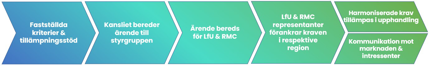 Processarbetet för harmonisering av miljökrav faller under nationella kansliets verksamhetsinriktning avtalsuppföljning. Inom ramen för avtalsuppföljning arbetar kansliet och regionerna redan enligt en nationell process från identifierade risker och möjligheter till gemensamma kravställningar och avtalsuppföljningar.