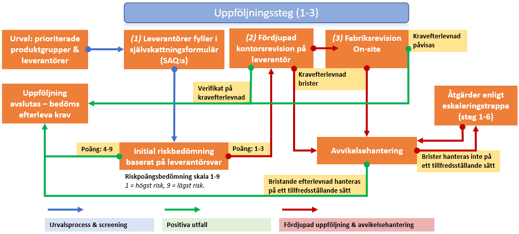 Idag genomförs nationella uppföljningar via systemstödet Worldfavor i en befintlig uppföljningsprocess med tillhörande rutiner, se processen i figur 5. I stället för att utveckla en parallell process behöver den befintliga uppföljningsprocessen uppdateras för att integrera uppföljning av miljökrav som ska följas upp genom nationell samordning.