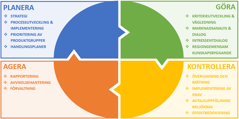 Strategin tillämpar en PDCA (planera-göra-kontrollera-agera) cykel som ramverk för samtliga processer (figur 6) för att säkra ett strukturerat och systematiskt tillvägagångssätt som är ändamålsenlig till syftet – att skapa relevanta och uppföljningsbara harmoniserade miljökrav inom prioriterade inköpskategorier som tillämpas i regionernas upphandlingar. Processerna matchar enligt följande med PDCA cykeln: