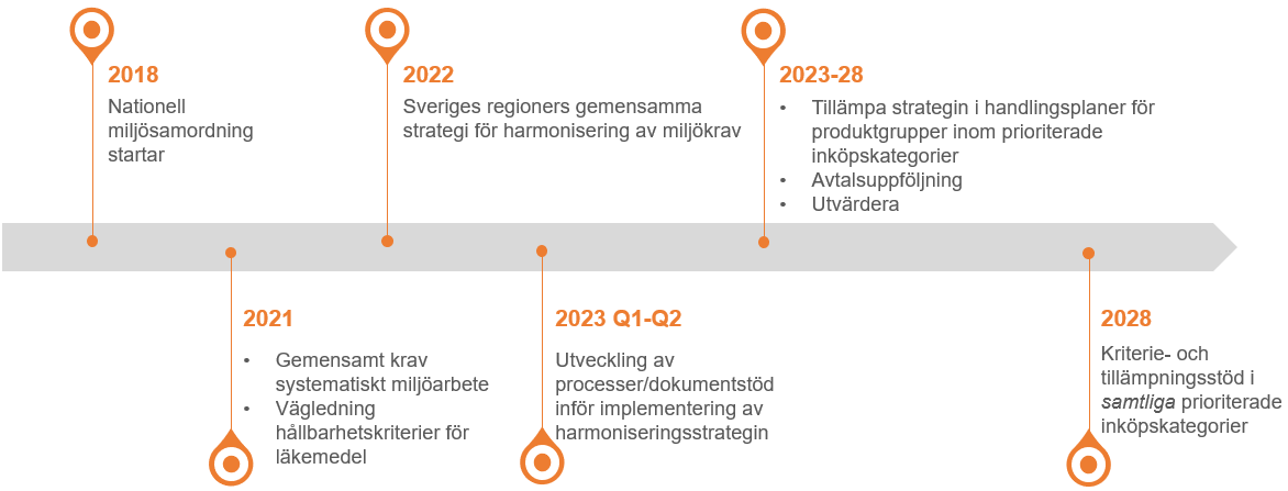 Figur 7 Tidslinje kansliets och regionernas harmoniseringsarbete för miljökrav Illustration: Nationella kansliet för hållbar upphandling.