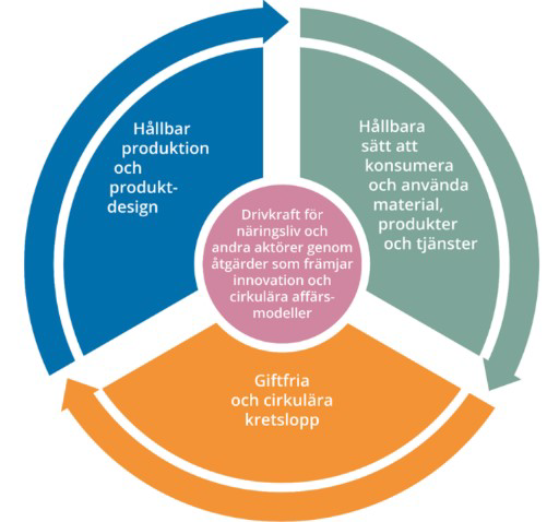 Den nationella strategin för cirkulär ekonomi som regeringen presenterade i juli 2020 pekar ut inriktningen för det arbete som behöver göras för att ställa om till cirkulär produktion, konsumtion och affärsmodeller, samt giftfria och cirkulära materialkretslopp. Visionen är ett samhälle där resurser används effektivt i giftfria cirkulära flöden och ersätter jungfruliga material.