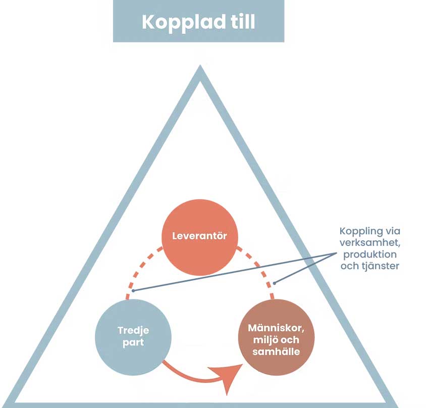 Ni är kopplade till negativ påverkan som orsakas av en underleverantör eller annan part, oavsett var i leveranskedjan den sker. Kopplingen definieras av sambandet mellan era produkter, tjänster eller verksamhet och den negativa påverkan. Att vara kopplad till är inte detsamma som direkta avtalsförhållanden.