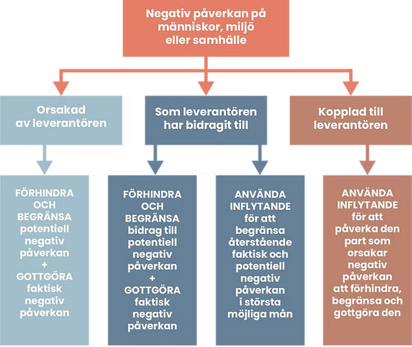 Om ni däremot inte har orsakat eller bidragit till den negativa påverkan, men ändå är kopplade till den, förväntas ni inte gottgöra den negativa påverkan. Däremot bör ni använda ert inflytande för att påverka den ansvariga parten att gottgöra den negativa påverkan, till exempel genom att ställa frågor.